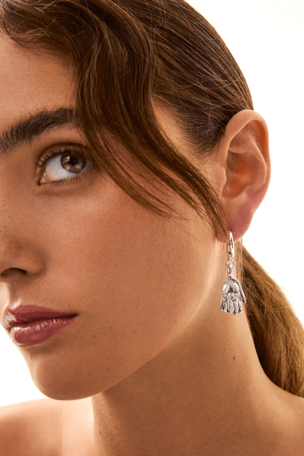 Realizados artesanalmente en bronce con un delicado enchapado de plata 925 y detalle de dije colgante, estas argollas son el MUST HAVE de nuestra coleccion. Son super livianos, se pueden usar durante todo el dia y en aquellas ocasiones especiales.