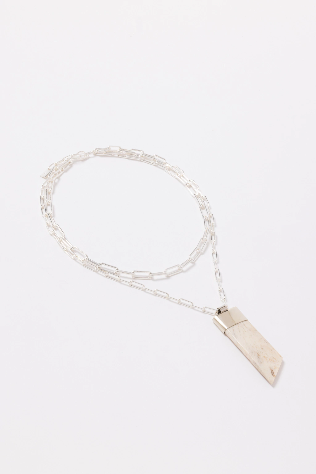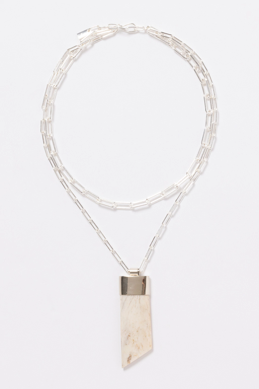 Collar realizado con doble cadena de cobre con baño enchapado en plata 925. Detalle de hueso pulido, engarzado en cazuela de alpaca.