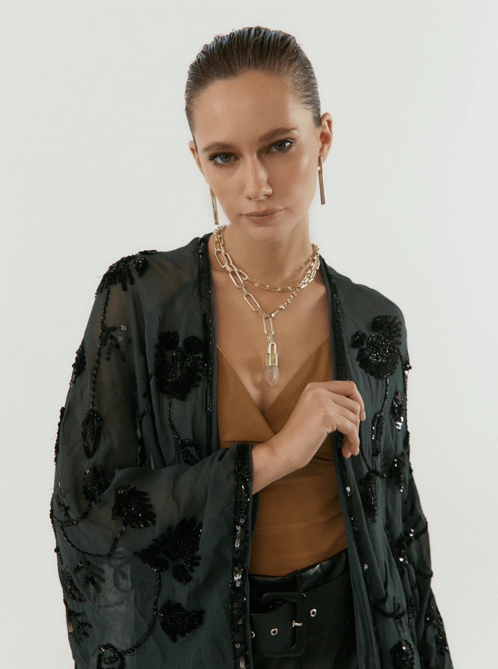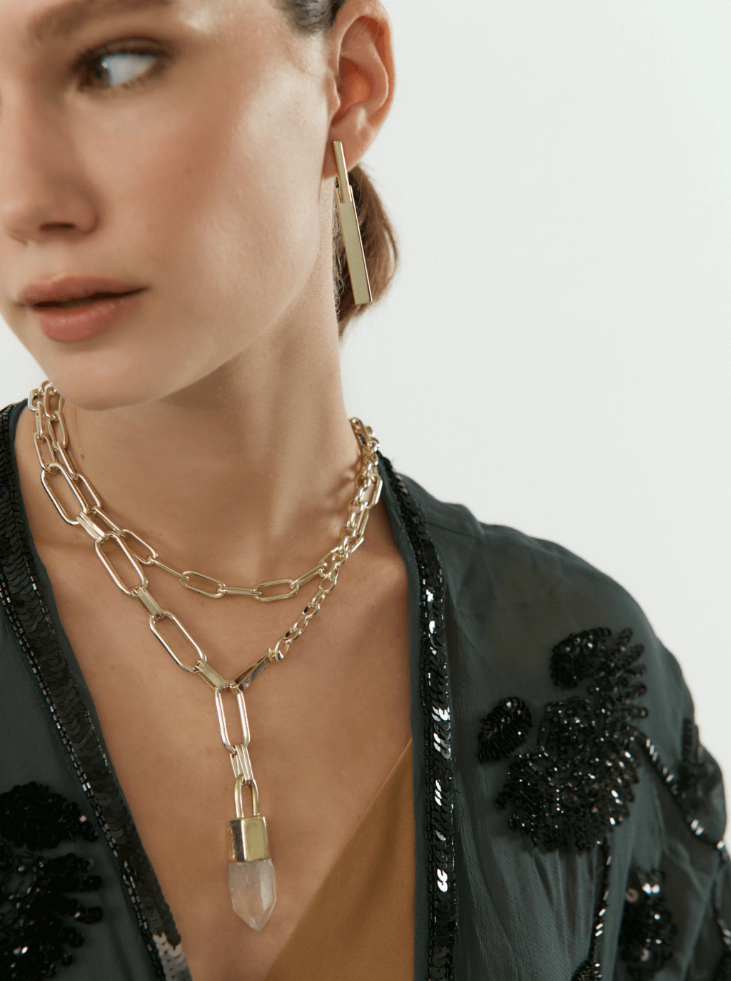 Este modelo es una joya artesanal que destaca por su sofisticación y diseño único. Combina distintas cadenas de bronce realizadas a mano con detalle de cuarzo , una piedra tan única, distintiva y dificil de encontrar. Todo el modeo está enchapado en oro 24 K.