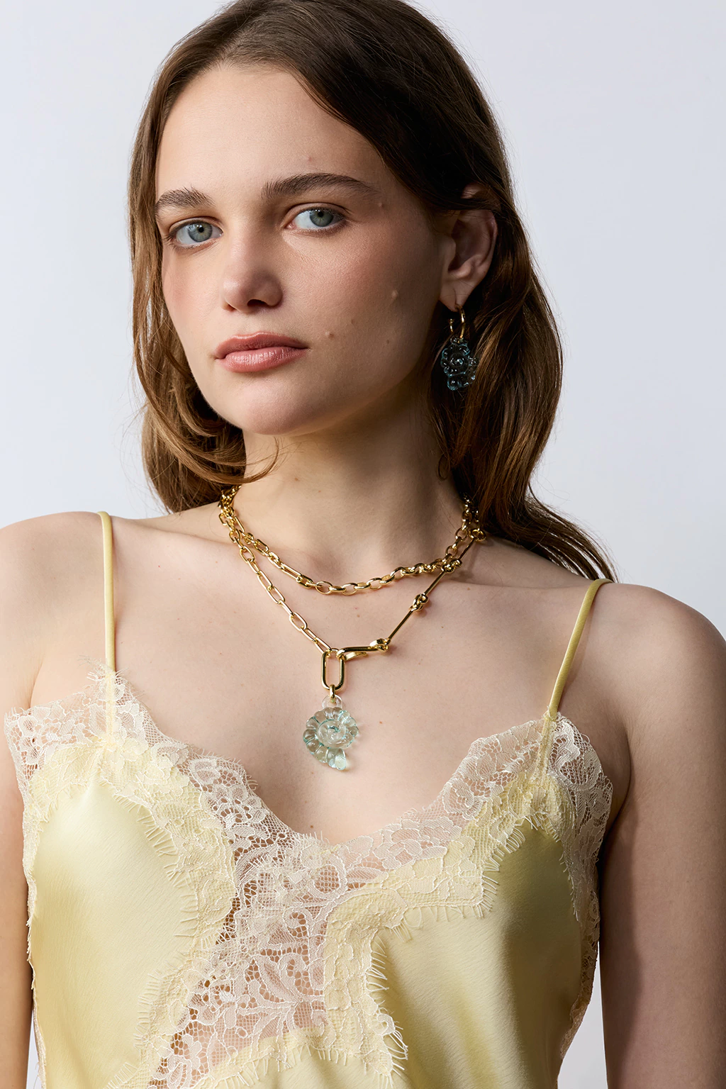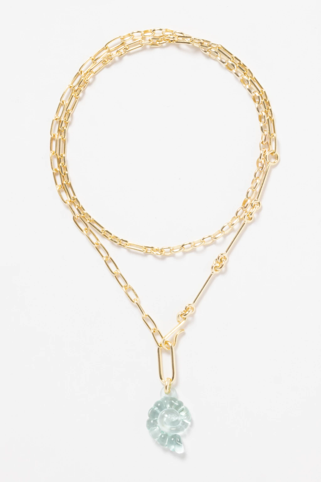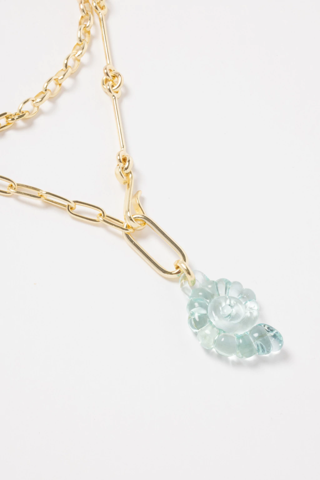 Descubrí el Collar Aruba Oro, una obra artesanal única que combina distintas cadenas de bronce con un delicado dije de vidrio en forma de caracol, en tonalidad aqua. Cada detalle está enchapado en oro 24 K.