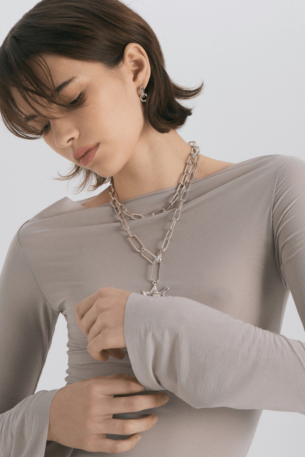 Collar realizado en cadena de cobre con baño en plata, y detalle de cuerno de asta con engarces de alpaca.