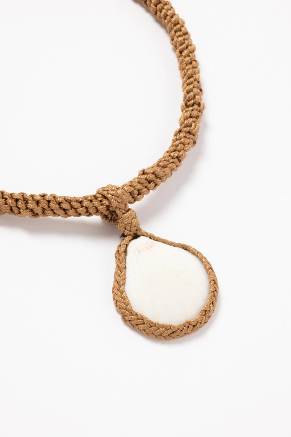 Collar realizado combinando cadenas en cobre y en bronce realizadas a mano, con baño en oro 24k. Detalle de cuarzo, con cazuela de bronce.
