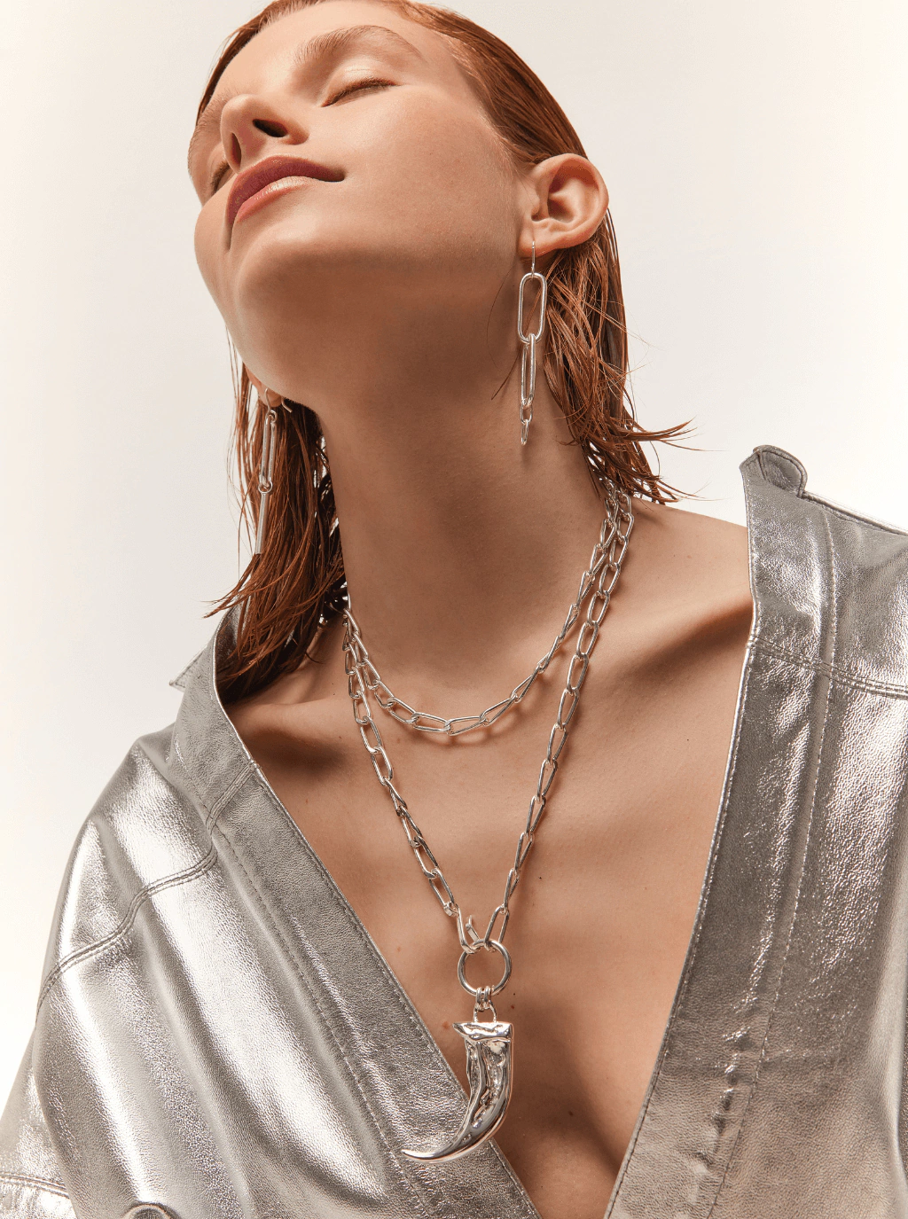 Collar realizado en cadena de cobre con baño en plata, y detalle de cuerno de asta con engarces de alpaca.