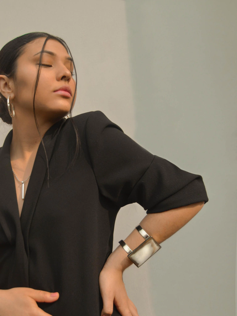 Nuestro brazalete regulable de alpaca es ideal para agregar un toque único a tu outfit y forma parte de nuestra linea ICONICS. Realizada en alpaca, tiene un detalle de asta rectangular en tonos crudos cuya medida es de 4 cm por 6 cm. Este diseño realizado a mano destaca por su diseño artesanal y su material natural.